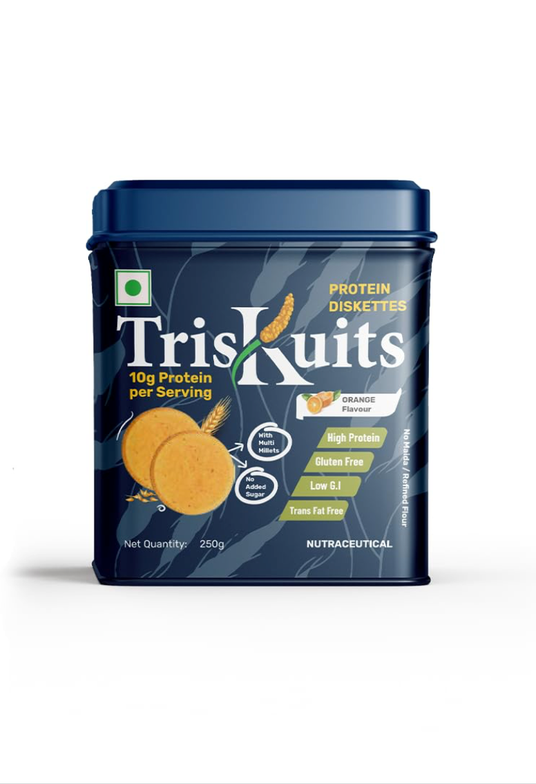 Triskuits by NUTRIVATE | High Protein Diskettes | 100% Veg | Enriched with Casein Protein and made with Multi-Grain Millets has Low GI, No Added Sugar, Gluten-Free, Trans-Fat Free | Orange