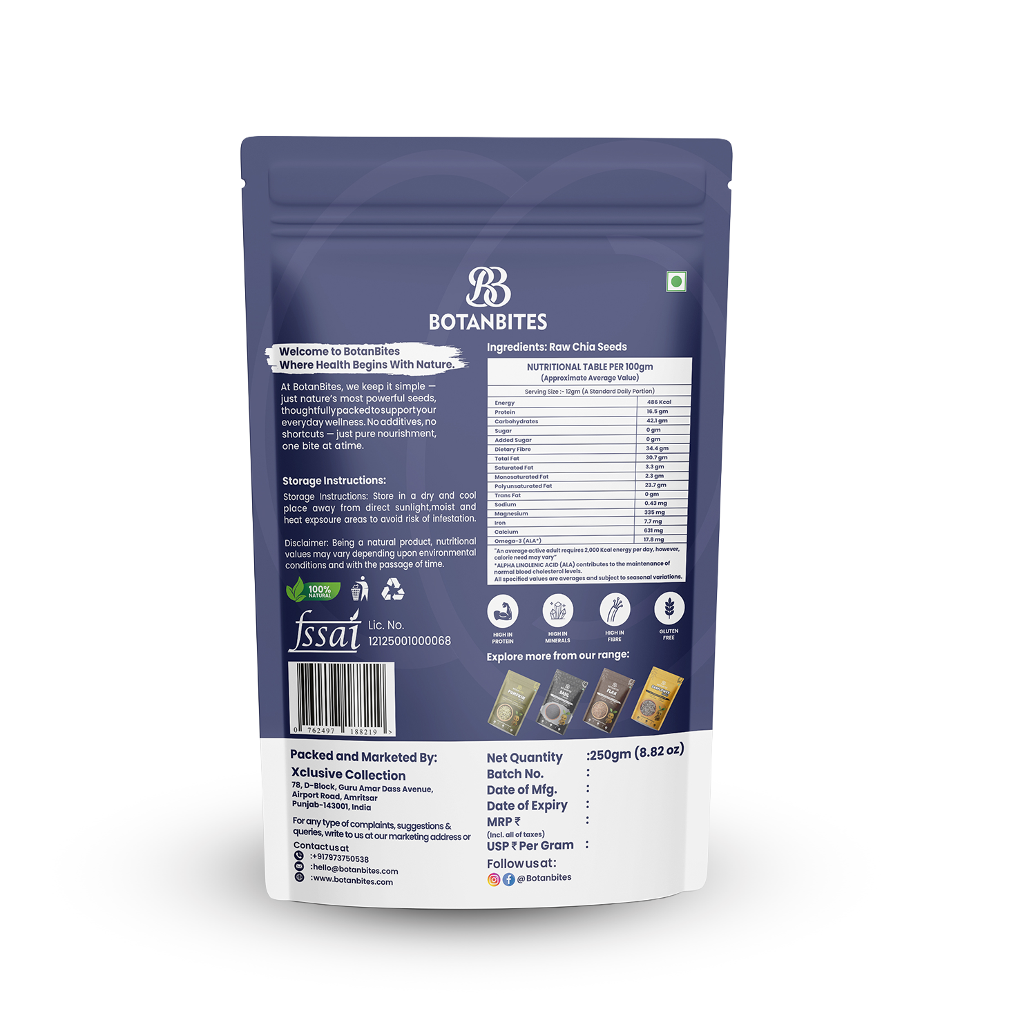 High in Omega-3 & Plant-Based Protein: BOTANBITES Chia Seeds are naturally rich in alpha-linolenic acid (ALA), a type of omega-3 that supports heart and brain health. Combined with plant-based protein, they help strengthen muscles and promote cell repair—perfect for vegetarians, vegans, and fitness enthusiasts.