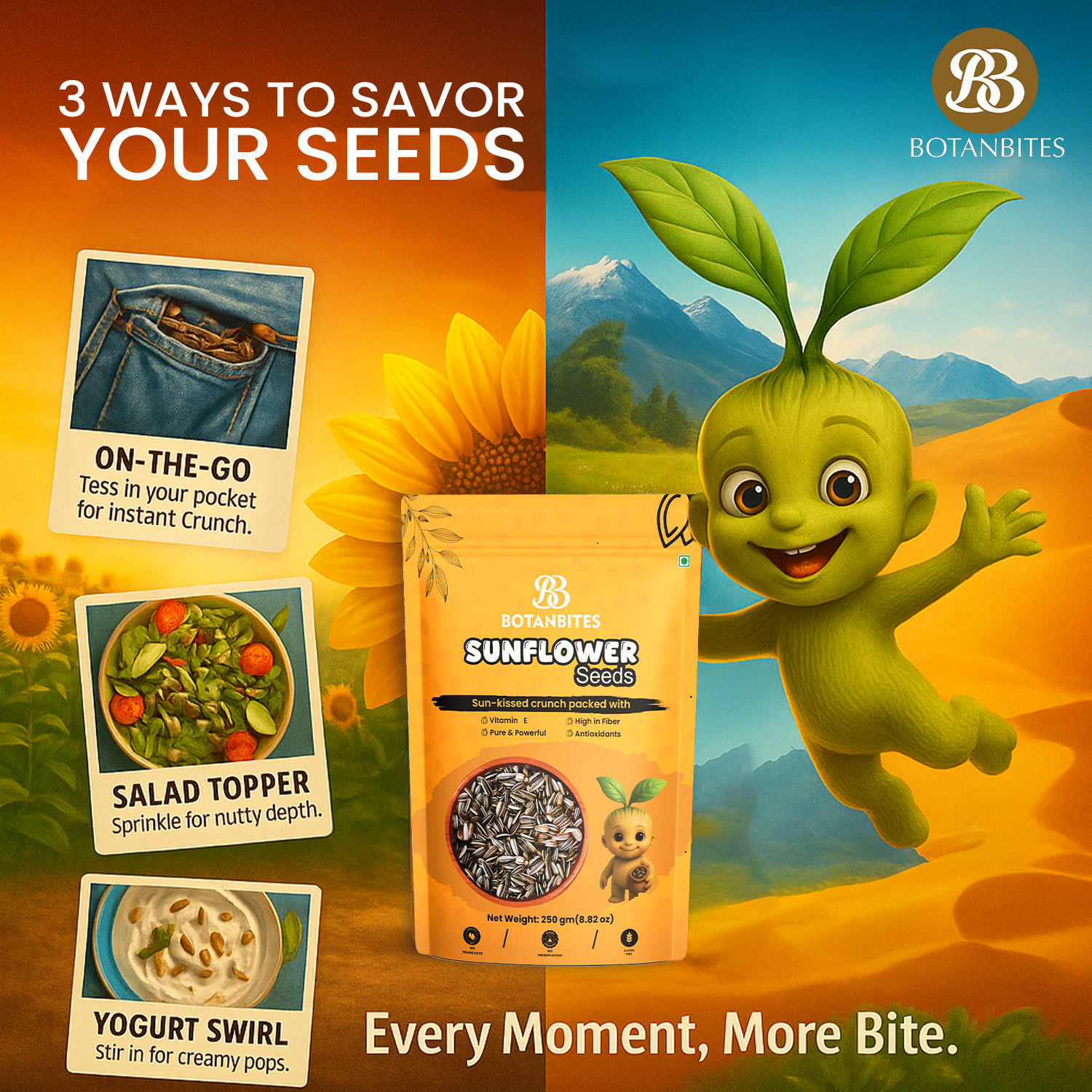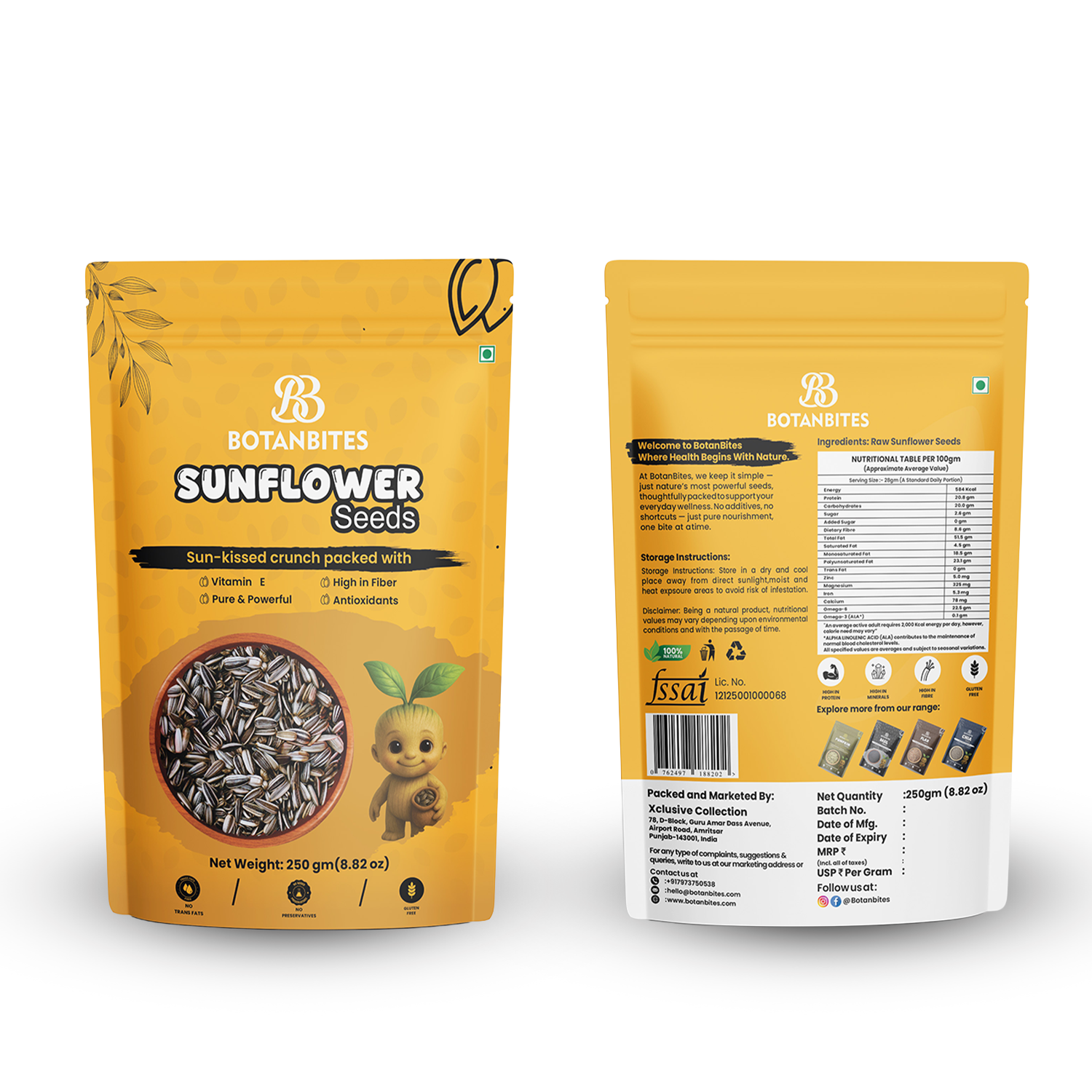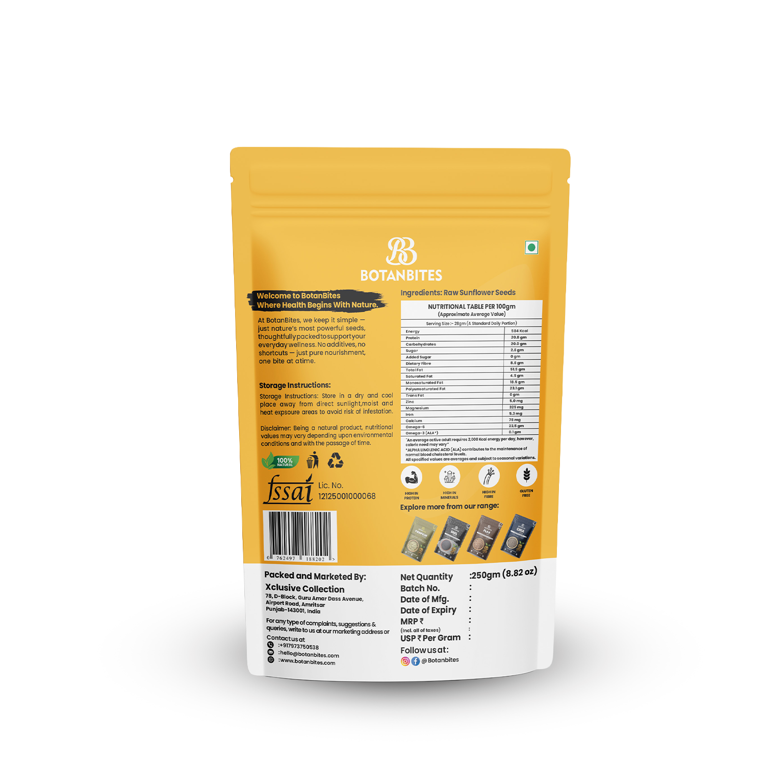 Serving Recommendation:- As a Snack: Enjoy a handful (approx. 28g) of sunflower seeds directly from the pack for a quick, healthy, and energizing snack between meals. In Salads: Sprinkle over fresh salads to add a crunchy texture and boost the protein and nutrient content. With Breakfast: Mix into oatmeal, yogurt, or smoothie bowls for a nutritious start to your day. For Baking: Add to bread, muffins, or granola bars for extra crunch and nutrition. As Toppings: Use as a topping for soups, stir-fries, or roasted vegetables for a nutty flavor profile. Roasted or Salted: Lightly roast with your favorite herbs or spices for a savory, custom-flavored treat.