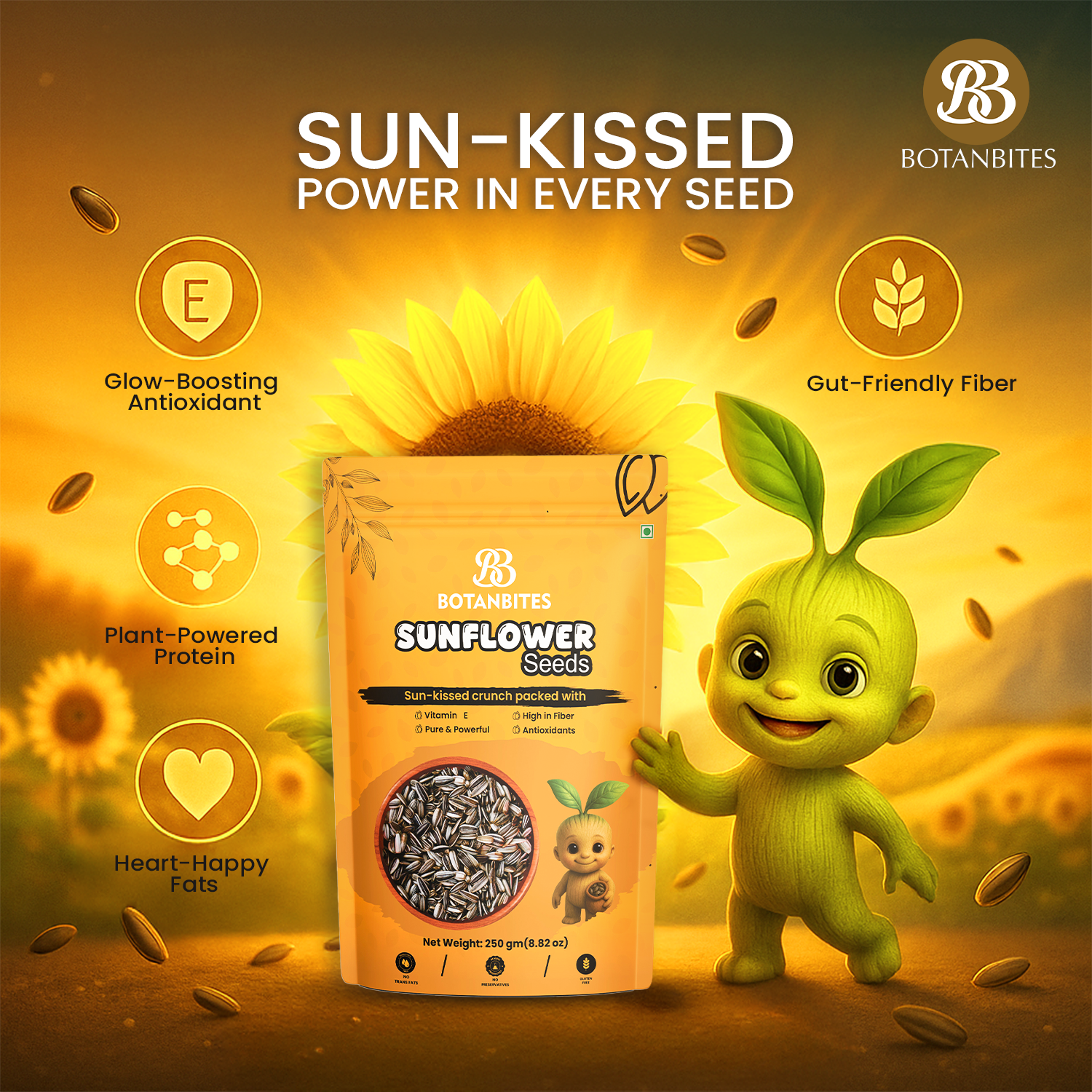 ✅Antioxidant-Rich Formula – Promotes Heart, Skin & Immune Health: BOTANBITES Sunflower Seeds are naturally rich in antioxidants like selenium and vitamin E, which help combat free radicals and reduce oxidative stress in the body. This can lead to improved cardiovascular function, youthful skin, and enhanced resistance against common illnesses. Including antioxidant-rich foods in your daily diet supports long-term health and vitality.