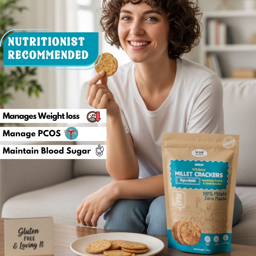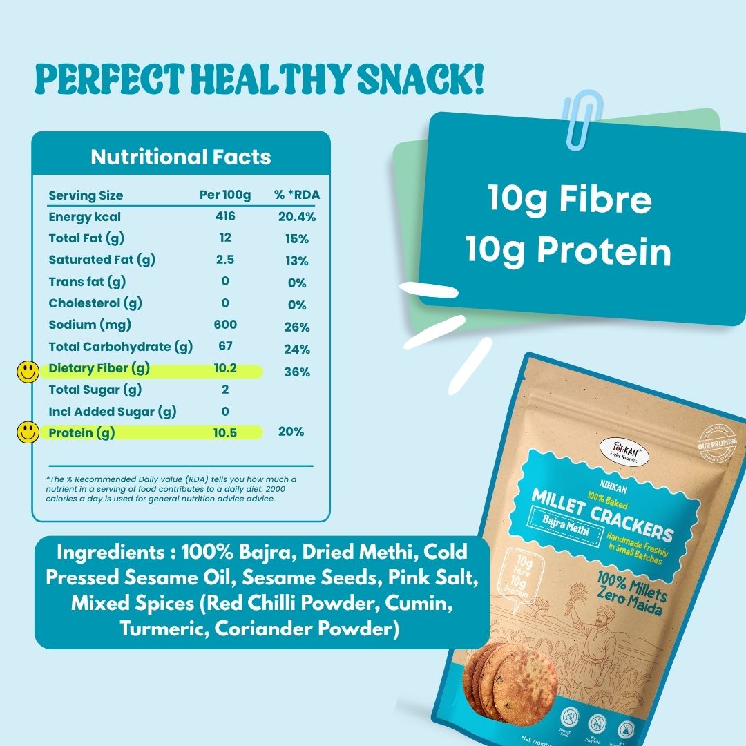 Healthy Diet friendly Millet Crackers : Indulge in Nihkan gluten-free millet crackers made from ancient grains Bajra (Pearl Millet); perfect for those looking for healthy diet snacks. Also for weight watchers, diabetic patients, and fitness enthusiasts seeking a nutritious snacking option. Nihkan Baked millet crackers are made with 100% millets and No Maida, No wheat, No Rice, ideal for Sugar control diets as well.