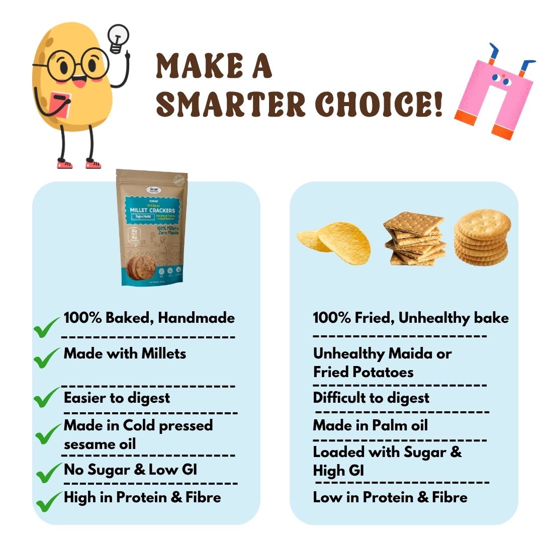 - Baked, Not Fried: Relish our millet crackers baked to perfection, ensuring a crunchy texture, crispy bite, and a healthier snacking option, free from excessive oil and calories. A better alternative to wheat khakhra which contains more carbs and more oil.