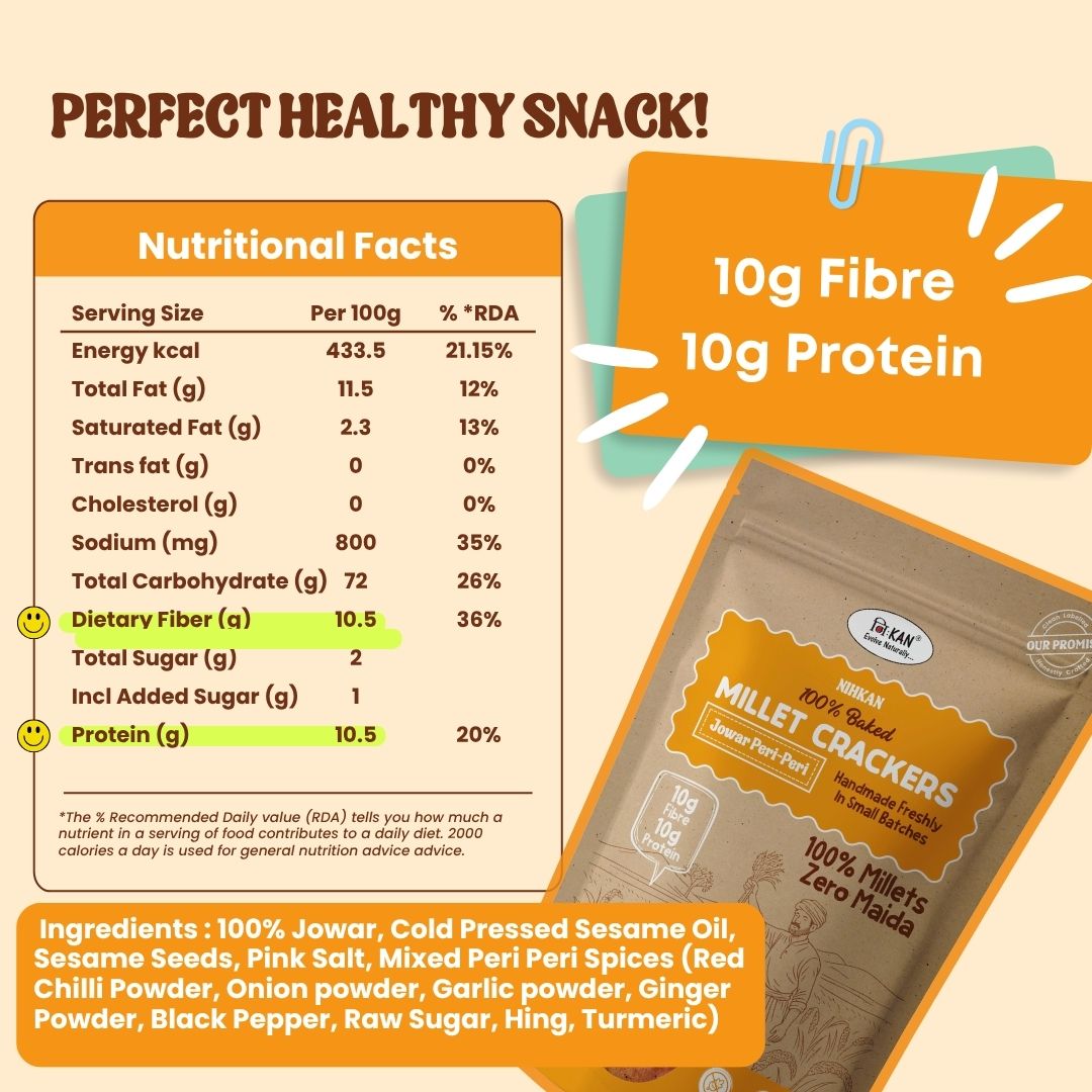 - Flavour : NihKan Gluten free Millet crackers are flavoured with mixed peri peri spices without any preservatives which gives perfect balance of taste & deliciousness.