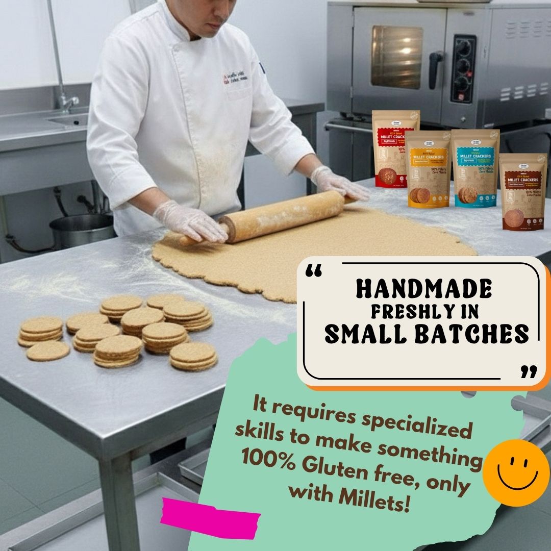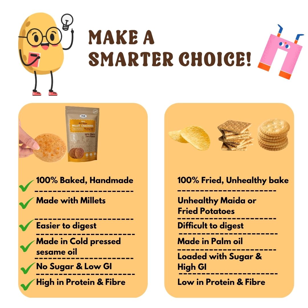 - 100% Whole Grains: Experience the nutritional benefits of our crackers made from 100% Millets, carefully selected to provide a superfood snack for your everyday healthy binge, packed with fibre, protein, and essential minerals.