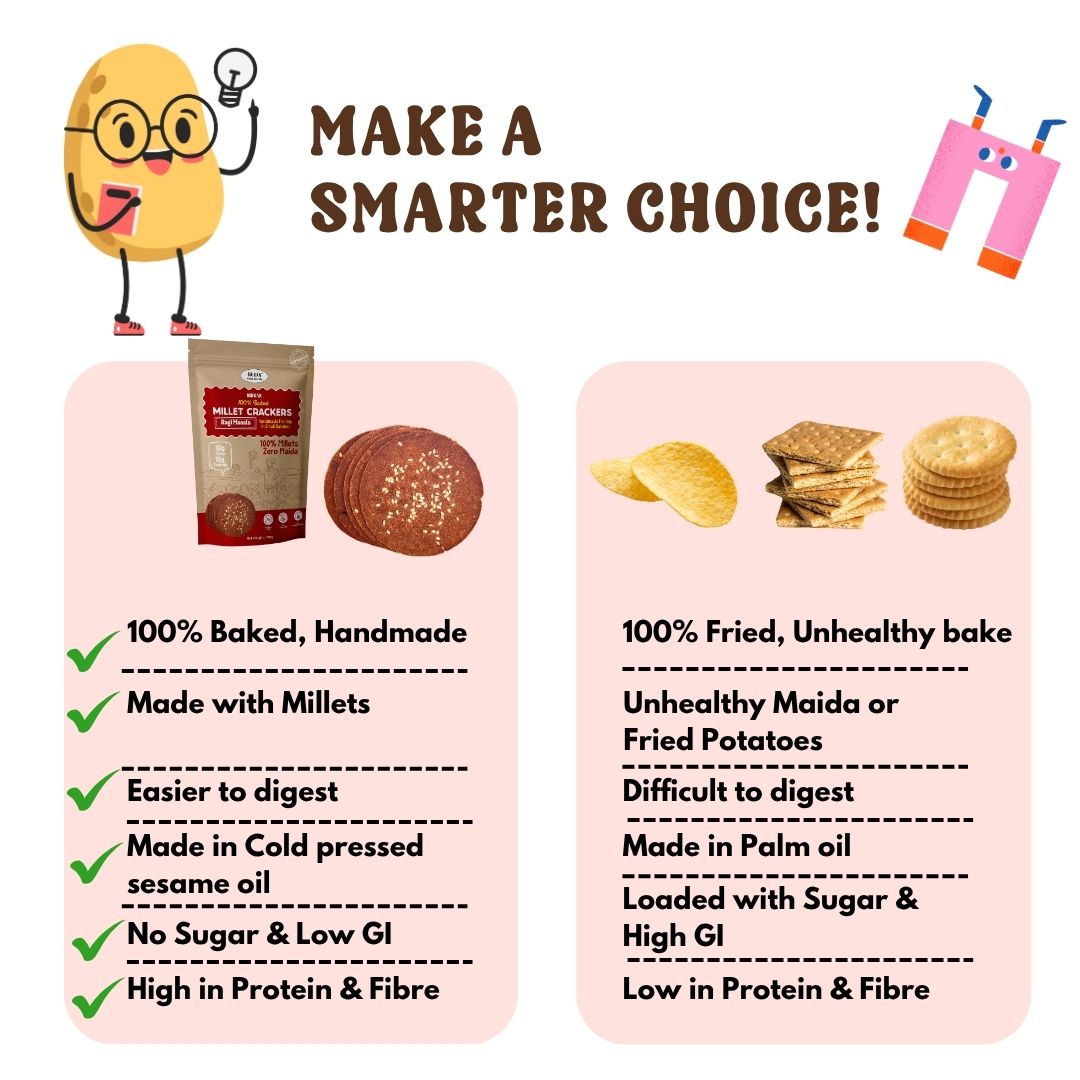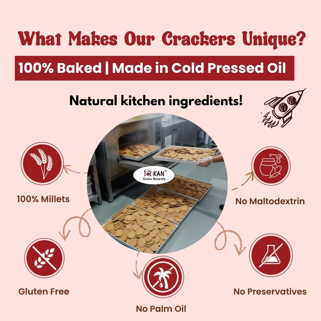 - Baked, Not Fried: Relish our millet crackers baked to perfection, ensuring a crunchy texture, crispy bite, and a healthier snacking option, free from excessive oil and calories. A better alternative to wheat khakhra which contains more carbs and more oil.